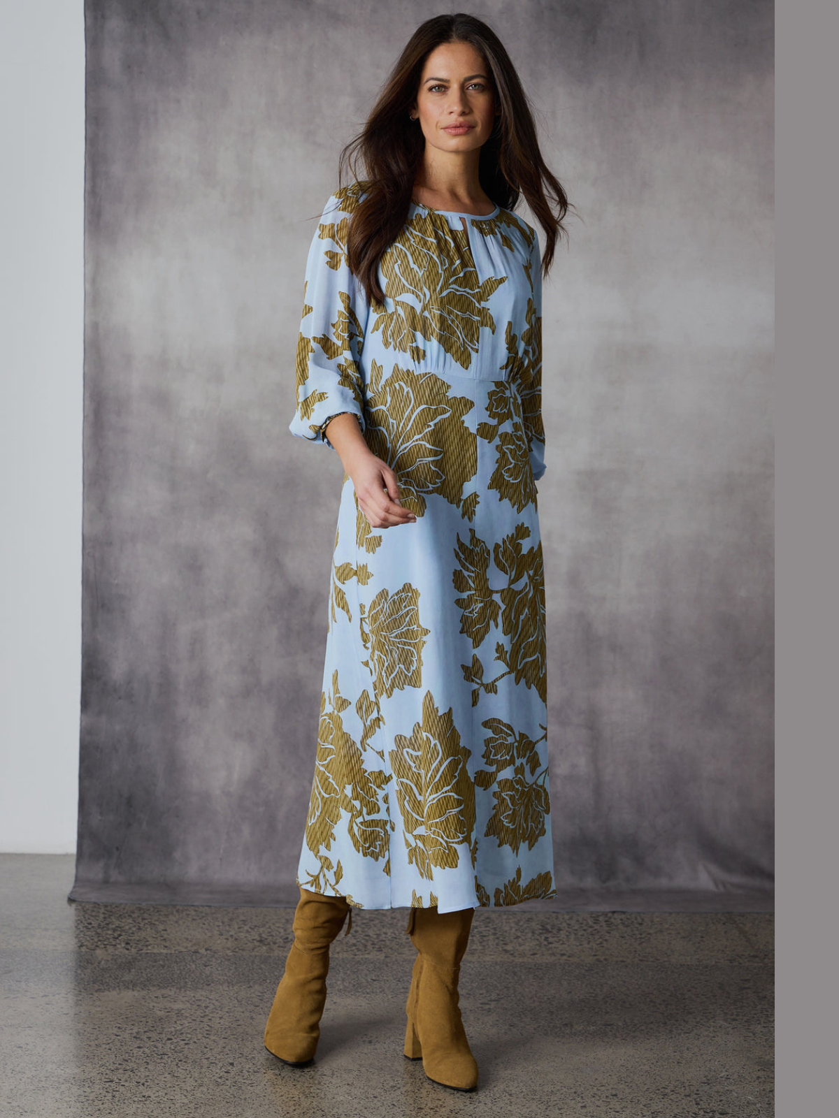 The Cello Dress is a slimline midi featuring a shaped under bust seam for a flattering fit. A keyhole opening with a front twist adds subtle allure, while softly gathered full-length sleeves with deep shirred cuffs complete the look. A timeless piece that exudes elegance and sophistication.