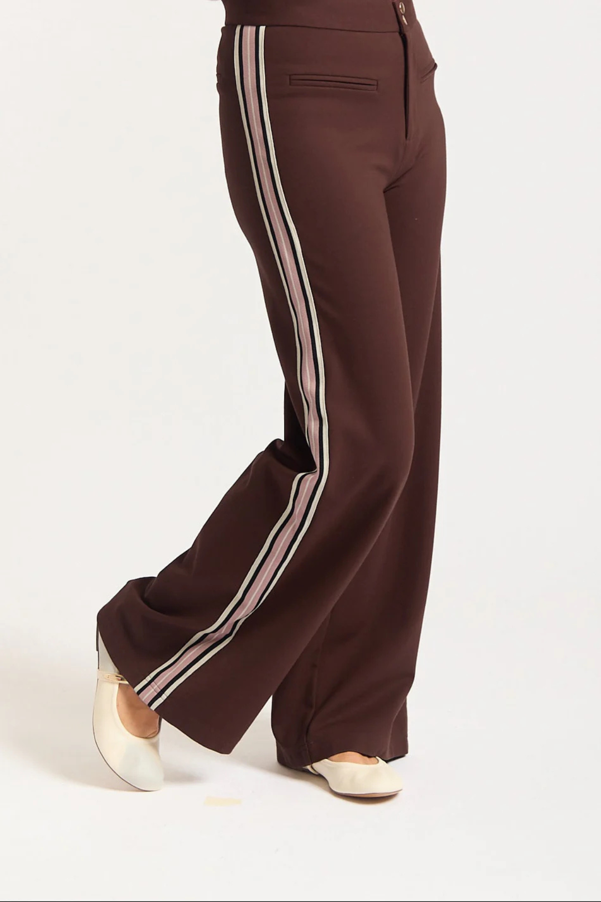 The Retreat Ponti Pant is a refined take on everyday comfort, crafted from a soft and stretchy blend of rayon, nylon, and spandex. Designed in a navy hue with sporty stripe detailing, it features a gold snap-button opening for a touch of polish. Faux front and back pockets create a clean, streamlined look, while the ponti fabric ensures structure and ease of movement. For best results, cold gentle hand wash is recommended.