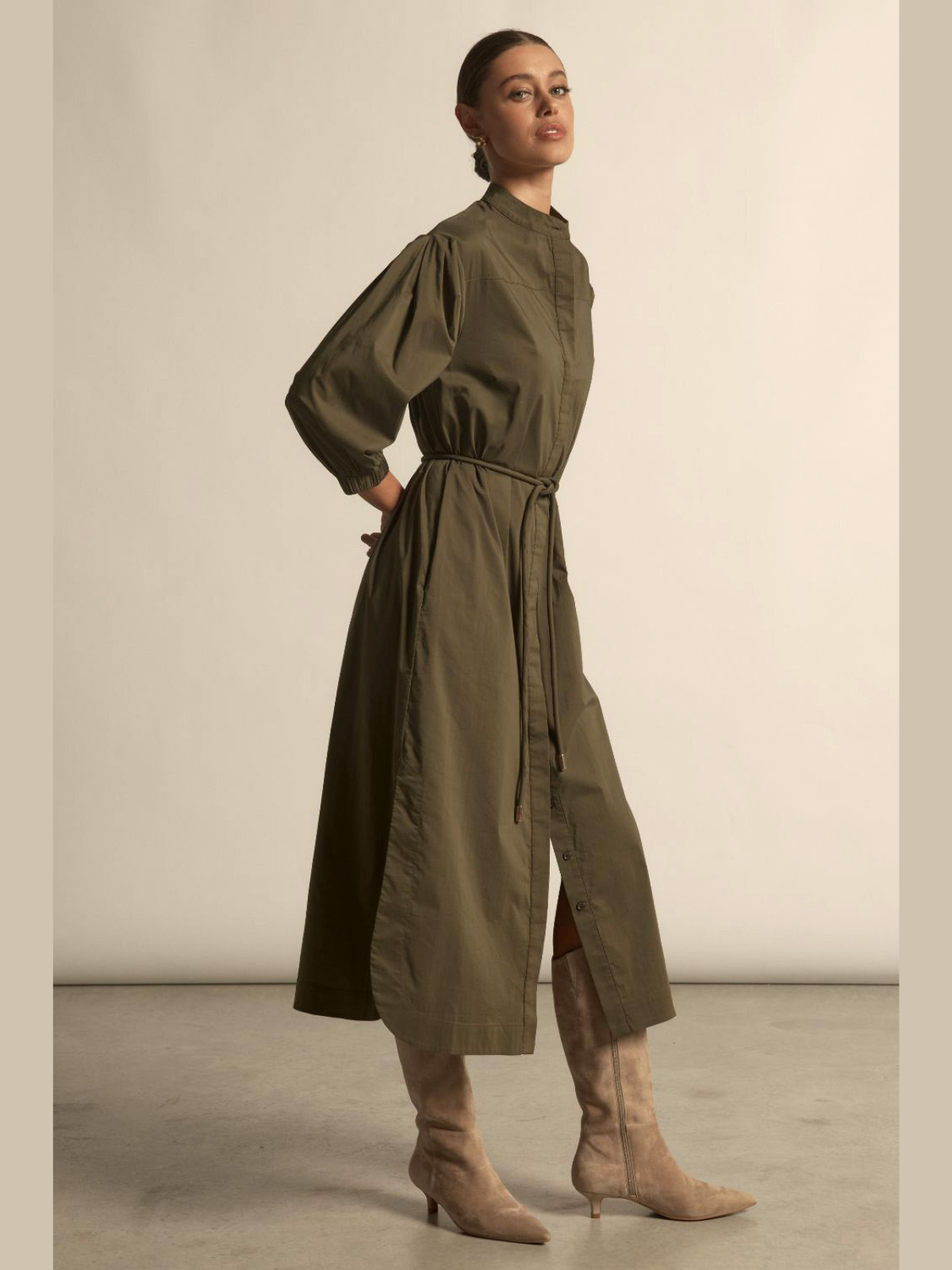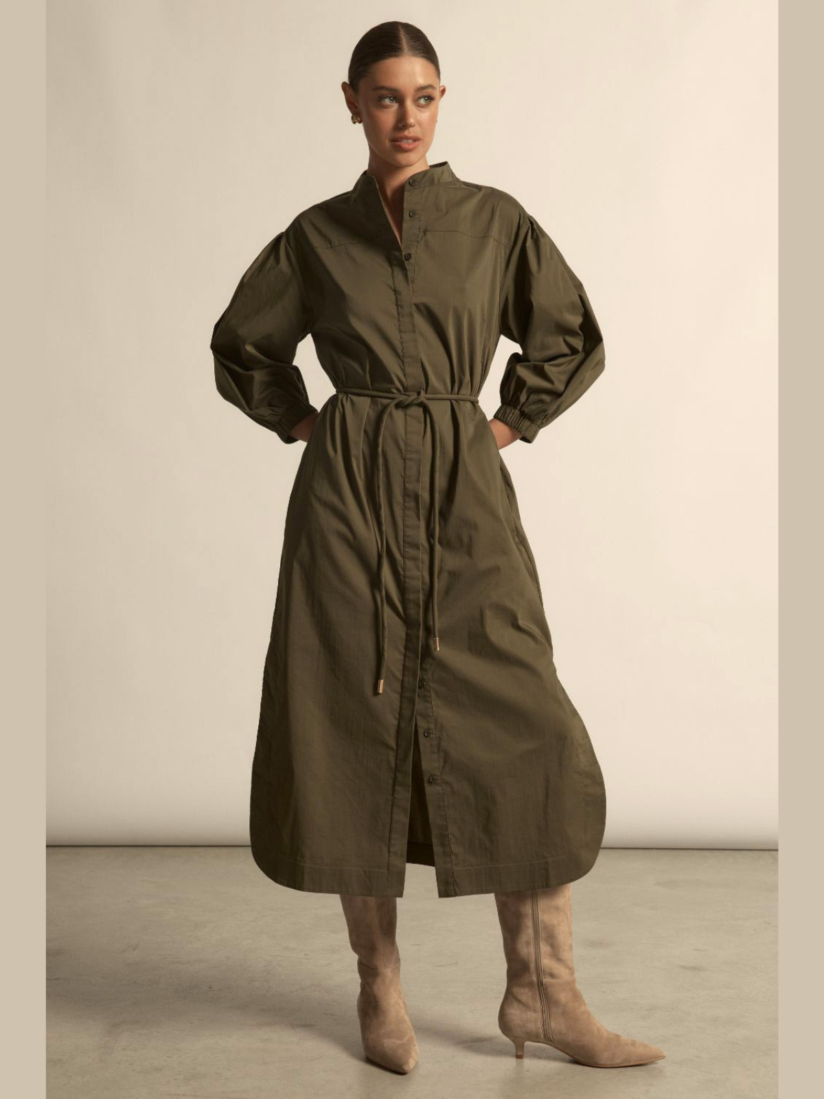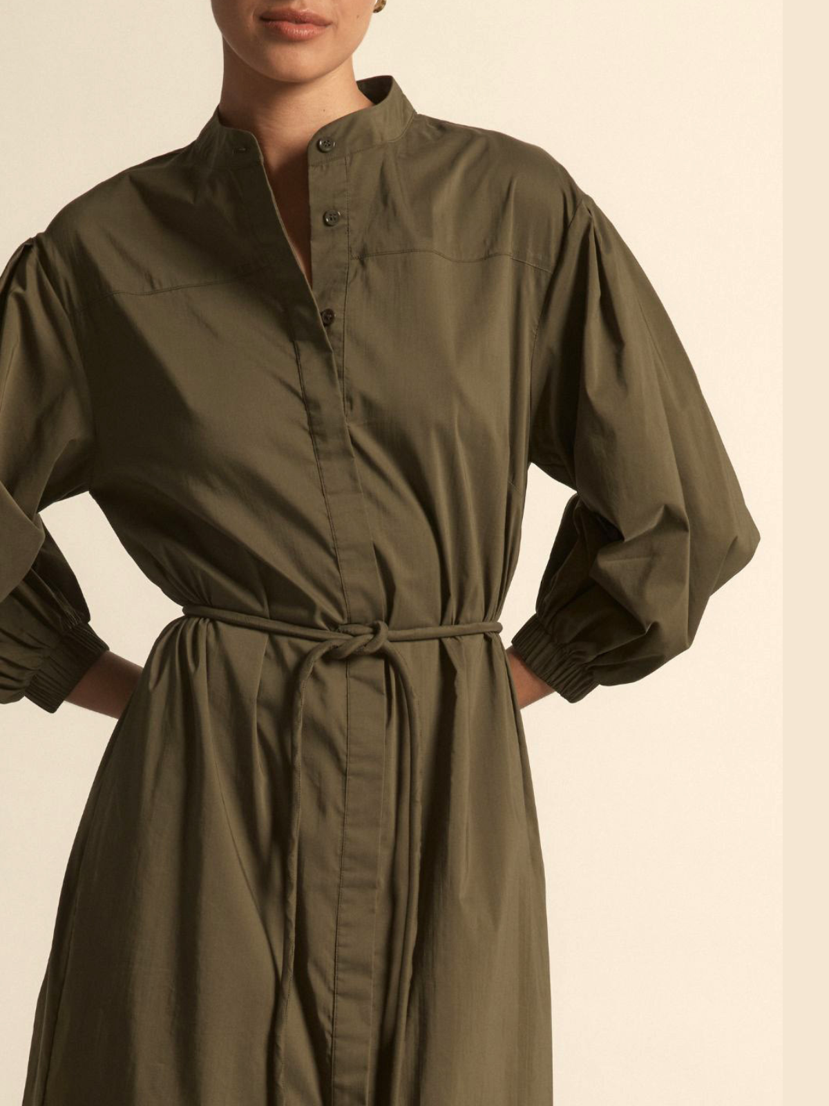 Effortless and enduring, the Jubilant Dress is a modern everyday staple designed with ease and quiet confidence. Crafted in a lightweight, trans-seasonal cotton, nylon and elastane blend, it features a relaxed off-the-body silhouette with a subtle yoke and back pleat for added movement. Dropped blouson sleeves with elasticated cuffs soften the shape, while a fabric rouleau belt with brass ends allows for versatile waist definition, finished with colour-matched shell buttons concealed beneath a clean, covered placket.